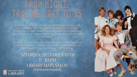 Prom Night: Take Me Back to '85 Friday, December 19th 8:00pm - 10:00pm Dust off your vintage lace, pull out the pastels, and join us for a night of 80s nostalgia! Our library prom will feature an 80s playlist, photo area with retro props, and refreshments inspired by classic punch-bowl parties. Guests can even vote for Prom Royalty based on the best 80s-inspired look - think ruffles, sparkle, and charm. Whether you’re reliving your prom days or experiencing the magic for the first time, this evening promises lighthearted fun, laughter, and a perfect excuse to dance. Registration required, sign-up by clicking the image above.