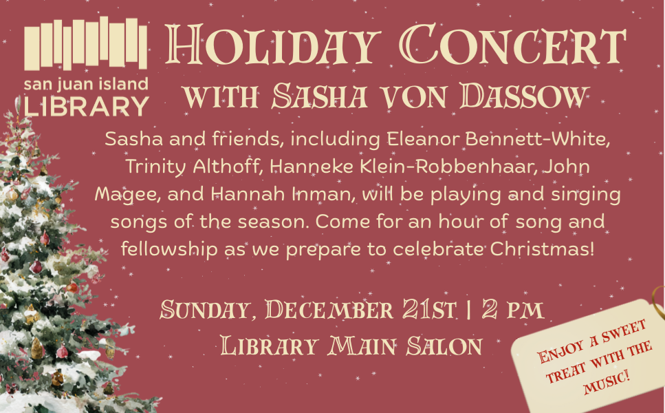 Holiday Celebration with Sasha von Dassow Sunday, December 21st, 2025 2:00pm-3:30pm Sasha and friends, including Eleanor Bennett-White, Trinity Althoff, Hanneke Klein-Robbenhaar, John Magee, and Hannah Inman, will be playing and singing songs of the season. Festive treats will also be served. Come for an hour of song and fellowship as we prepare to celebrate Christmas!