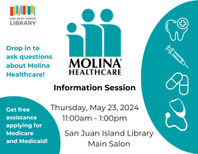 Molina Healthcare Tabling Drop in to the Library on Thursday, May 23rd 11am to 1pm to ask questions about Molina Healthcare. Get free assistance applying for Medicare and Medicaid!