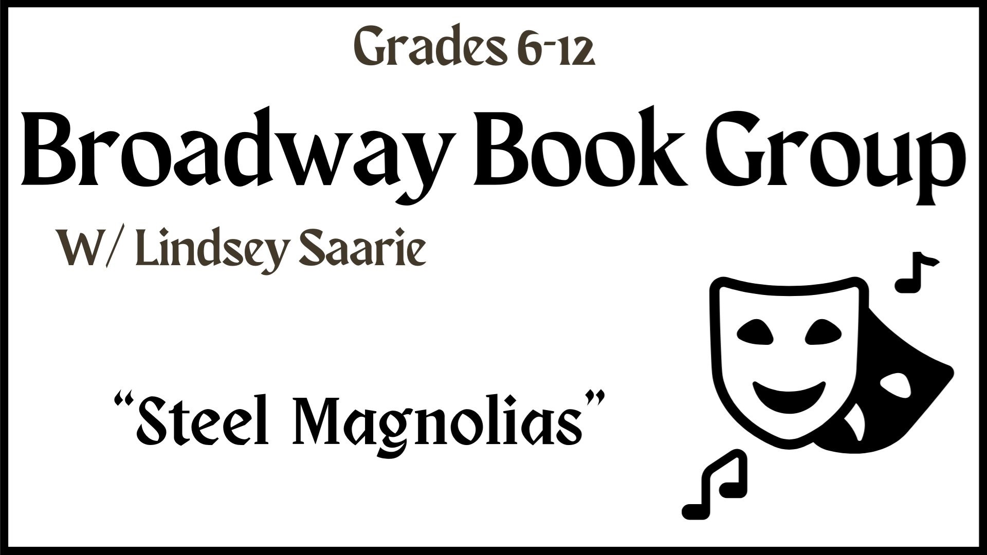 TEENS Broadway Book Group Register now for June's Teen Broadway Book Group! This two session series led by Acting Coach Lindsey Saarie is for actors and musical lovers alike. Participants will read Steel Magnolias in the first meeting and then reunite two weeks later to watch the film adaptation. Open to youth in grades 6-12!