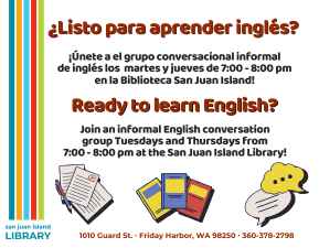 English Language Learning Conversation Circles Un grupo conversacional informal en apoyo del aprendizaje de Inglés. Sin cargo y abierto al publico, de 7:00 a 8:00 pm, presentado por la Biblioteca San Juan Island. Favor de entrar por la puerta lateral. An informal conversational group in support of English language learning. Free and open to the public from 7:00 to 8:00 pm, presented by the San Juan Island Library. Please enter through the side door.
