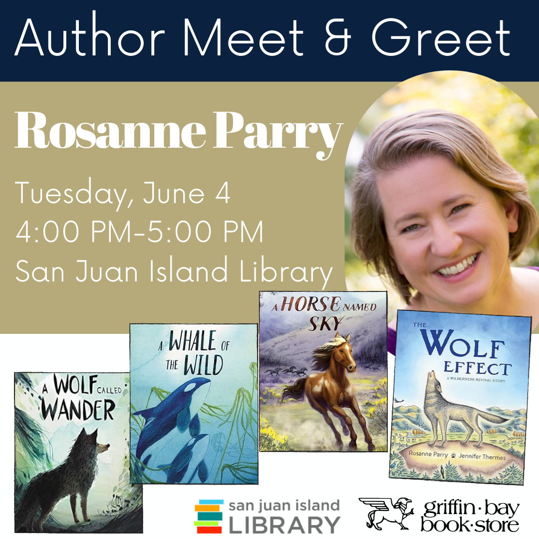 YOUTH Rosanne Parry Author Meet and Greet Stop by the San Juan Island Library on June 4th at 4pm to meet Rosanne Parry, New York Times best-selling author of the Voice of the Wilderness series and Whale of the Wild about a young orca’s survival navigating the delicate ecosystems of the Salish Sea.