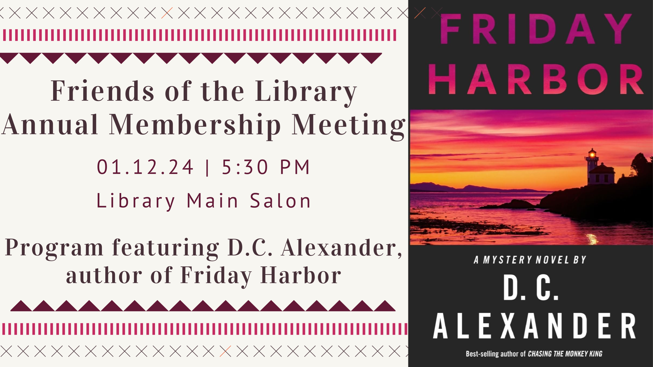 FRIENDS OF THE LIBRARY ANNUAL MEETING & PROGRAM Learn all about what the Friends of the Library have been up to! Following the meeting, join us for a special program featuring D.C. Alexander, author of "Friday Harbor" a mystery novel set in the San Juan Islands during the prohibition era.