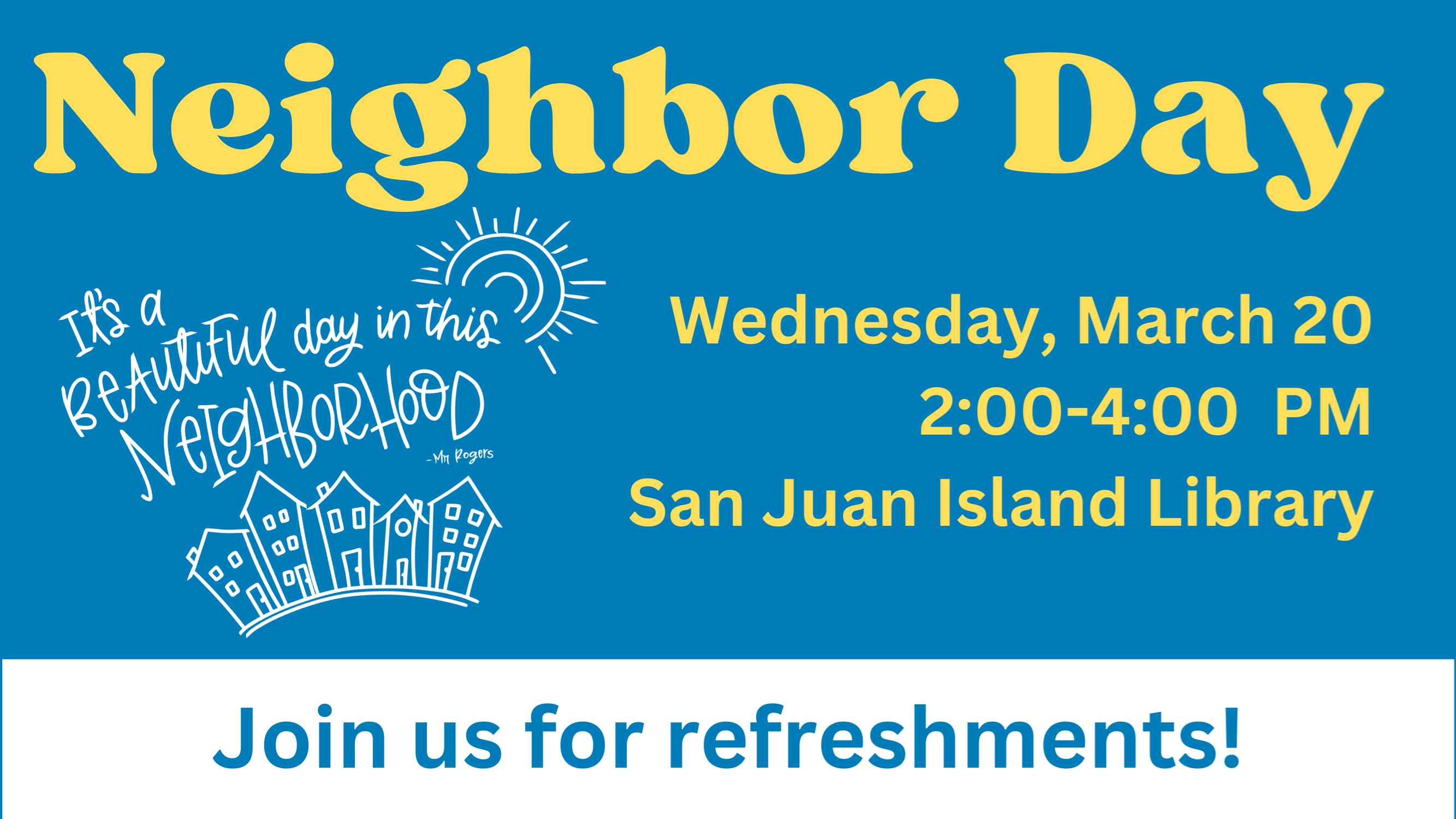 NEIGHBOR DAY Join us for refreshments and other activities as we celebrate our first Neighbor Day at San Juan Island Library. Come meet your neighbors - Library staff, friends and families, and other members of our beloved island community who call San Juan Island home.