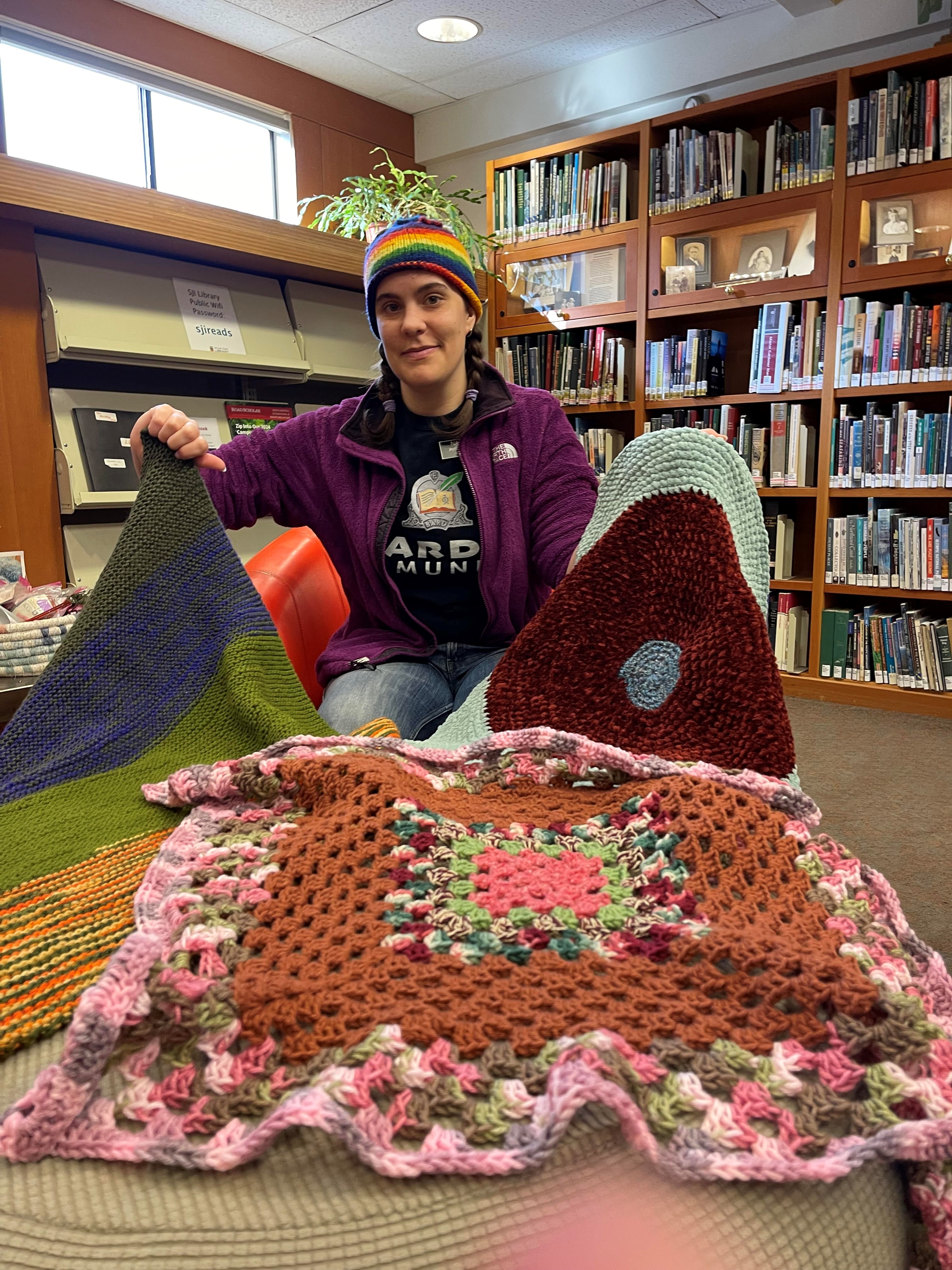 Naomi's Knitting We keep a basket of yarn by the fireplace, and community members work together to make winter blankets for the Animal Shelter. Library Superstar Naomi worked on some of latest creations sent to the shelter. These donations are both beautiful and cozy, and we are grateful to Naomi and all the knitting volunteers for helping our furry friends to have something comfortable to sleep on. What to join in? Join the Knitting Underground at the fireplace for knitting and conversation each Thursday at 12:30-2pm.