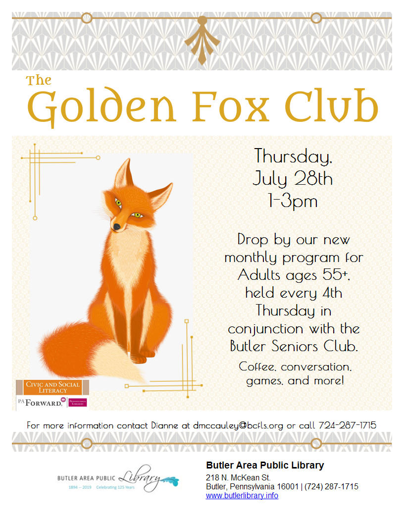 Golden Fox ClubJuly 28, 1-3pm Basement Meeting Room Drop by our new monthly program for adults ages 55+, held every 4th Thursday, in conjunction with the Butler Seniors Club. Coffee, conversation, games, and more! 724-287-1715.