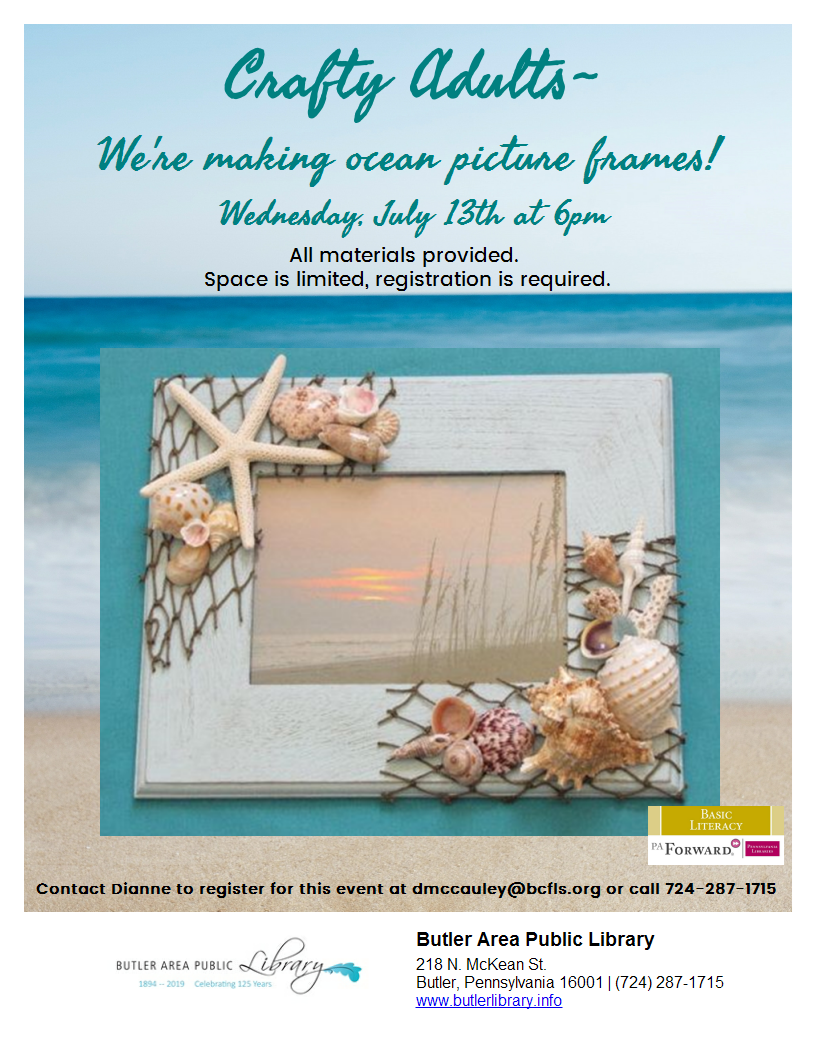 Crafty Adults July 13, 6pm Basement Meeting Room We're making ocean picture frames! All materials will be provided, but space is limited so please register with Dianne at dmccauley@bcfls.org or 724-287-1715.