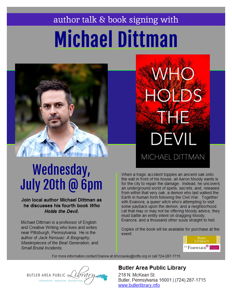 Author Talk: Michael Dittman July 20, 6pm Basement Meeting Room Local author Michael Dittman will discuss his fourth book, Who Holds the Devil. Copies of the book will be available to purchase.
