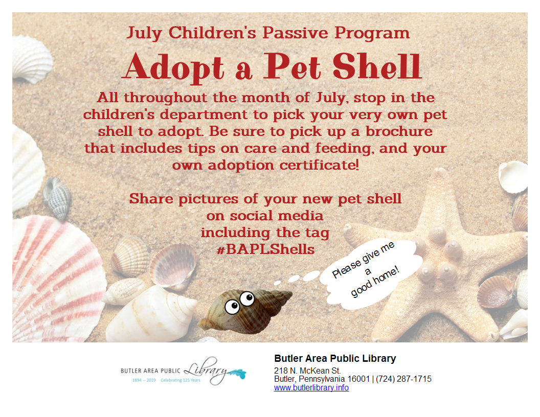 Adopt a Pet Shell July 1-31 Children's Department Stop in and pick our your very own pet shell to adopt. Be sure to pick up a brochure that includes tips on care and feeding, and your adoption certificate! For more information, contact Ms. Tiffany, tharkleroad@bcfls.org