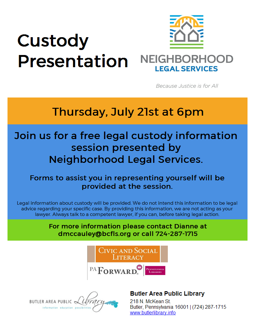Custody Information PresentationJuly 21, 6pm Basement Meeting Room Join us for a free legal custody information session, presented by Neighborhood Legal Services. Forms to assist you in representing yourself will be provided at the session. Contact Dianne at dmccauley@bcfls.org with questions. Legal information about custody will be provided. We do not intend this information to be legal advice regarding your specific case. By providing this information, we are not acting as your lawyer. Always talk to a competent lawyer, if you can, before taking legal action.