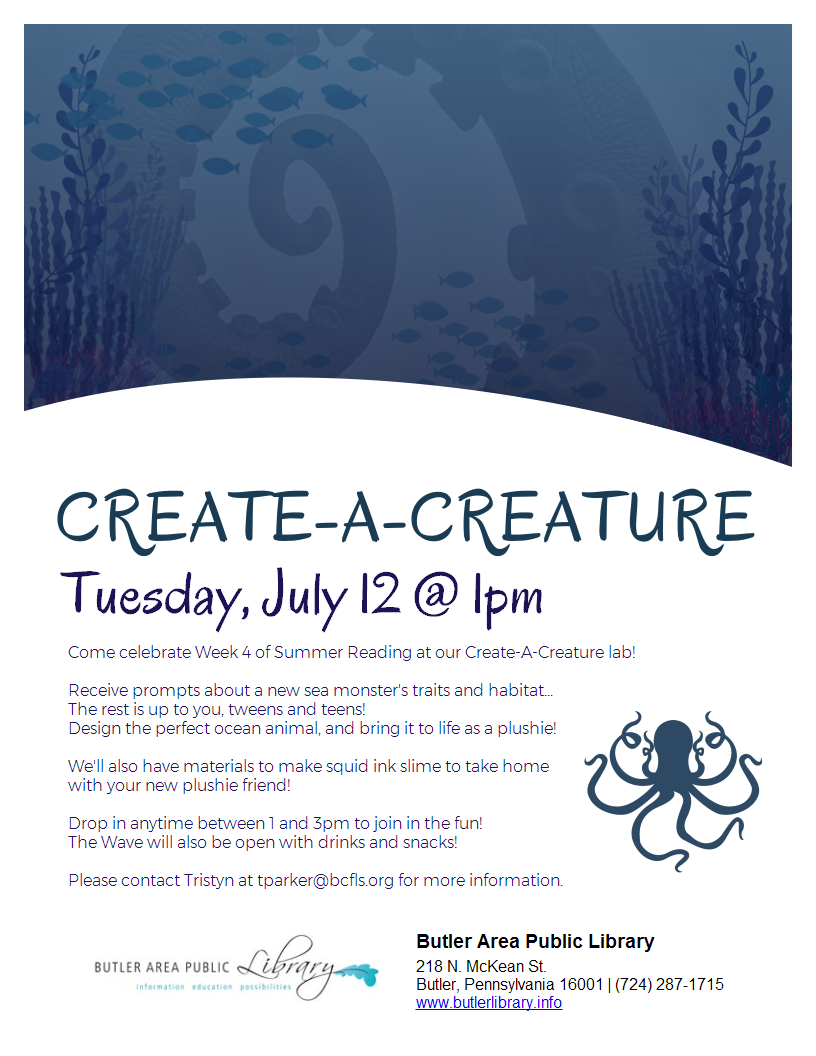 YA Create-A-Creature July 12, 1-3pm YA Zone At our Create-A-Creature lab, you'll receive prompts about a new sea monster's traits and habitat...The rest is up to you! Design the perfect ocean animal, and bring it to life as a plushie! We'll also have materials to make squid ink slime to take home with your new plushie friend! Drop in anytime between 1 and 3pm to join in the fun! The Wave will also be open with drinks and snacks!