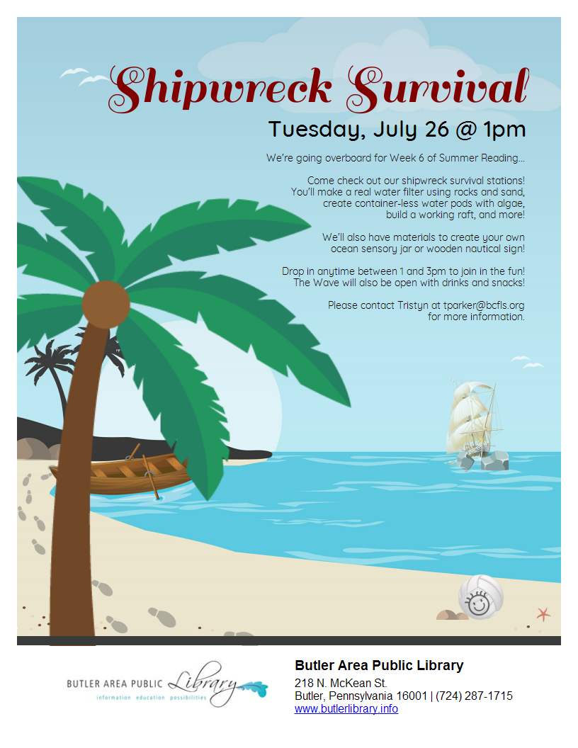 YA Shipwreck Survival June 28, 1-3pm YA Zone At our shipwreck survival stations, you'll make a real water filter using rocks and sand, create container-less water pods with algae, build a working raft, and more! We'll also have materials to create your own ocean sensory jar or wooden nautical sign! Drop in anytime between 1 and 3pm to join in the fun! The Wave will also be open with drinks and snacks!