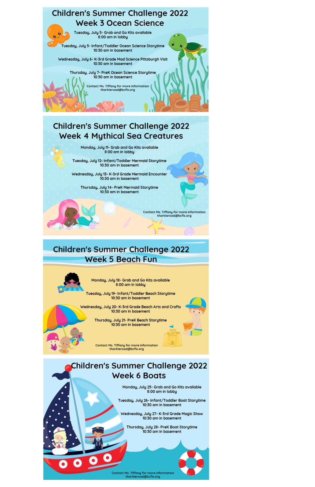 Kids Summer Reading ChallengeWeekly Programs: June 21-Aug 11 Basement Meeting Room In-person Summer Challenge activities return! Register for your age group on Beanstack butlerlibrary.beanstack.org to log your progress. Read books, do activities, earn badges, win prizes! Each week we will have a grab and go kit, themed storytimes, and a K-3 age program. Ocean Science Week July 5 - Grab and Go Kits July 5 - Toddler Ocean Science Storytime, 10:30am July 6 - K-3rd Mad Science Pittsburgh Visit, 10:30am July 7 - Preschool Ocean Science Storytime, 10:30am Mythical Sea Creatures Week July 11 - Grab and Go Kits July 12 - Toddler Mermaid Storytime, 10:30am July 13 - K-3rd Mermaid Encounter, 10:30am July 14 - Preschool Mermaid Storytime, 10:30am Beach Fun Week July 18 - Grab and Go Kits July 19 - Toddler Beach Storytime, 10:30am July 20 - K-3rd Beach Arts and Crafts, 10:30am July 21 - Preschool Beach Storytime, 10:30am Boat Week July 25 - Grab and Go Kits July 26 - Toddler Boat Storytime, 10:30am July 27 - K-3rd Magic Show, 10:30am July 28 - Preschool Boat Storytime, 10:30am