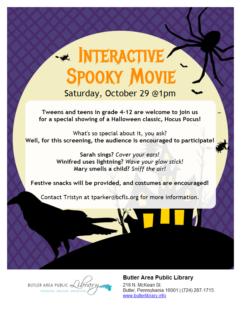 Tweens and teens in grades 4-12 are welcome to join us for a special showing of a Halloween classic! Watch the story of three witchy sisters amok on a revenge kick. Festive snacks will be provided, and costumes encouraged.