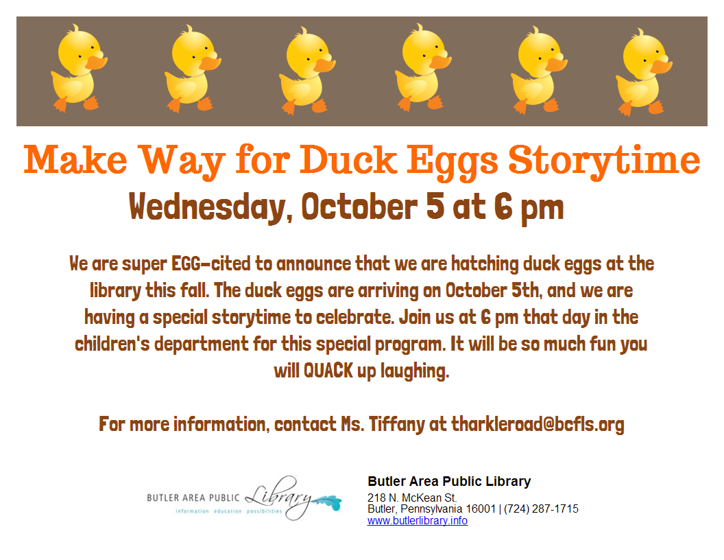 We are super EGG-cited to hatch duck eggs at the library this fall. The eggs are arriving on October 5, and we are having a special storytime to celebrate. Join us at 6pm in the children's department for this special program. It will be so much fun you will QUACK up laughing.