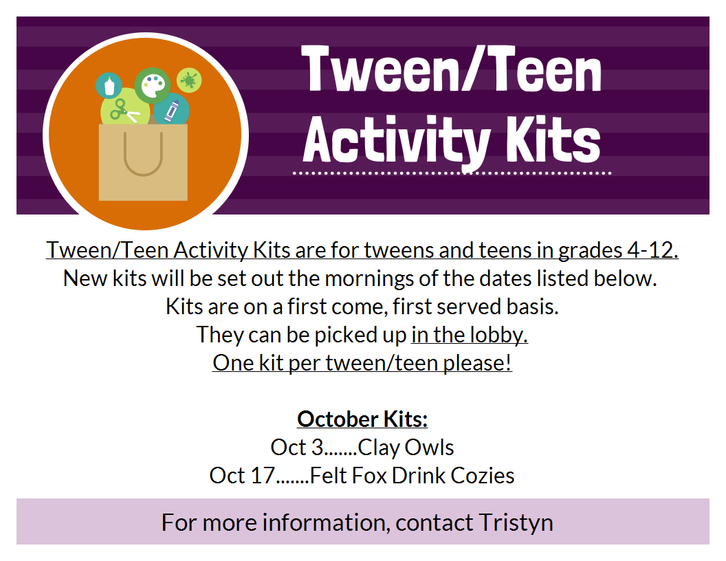 New kits for tweens and teens in grades 4-12 will be available on the above dates. Kits are available on a first come, first serve basis. Pick up in the lobby - one kit per person please!