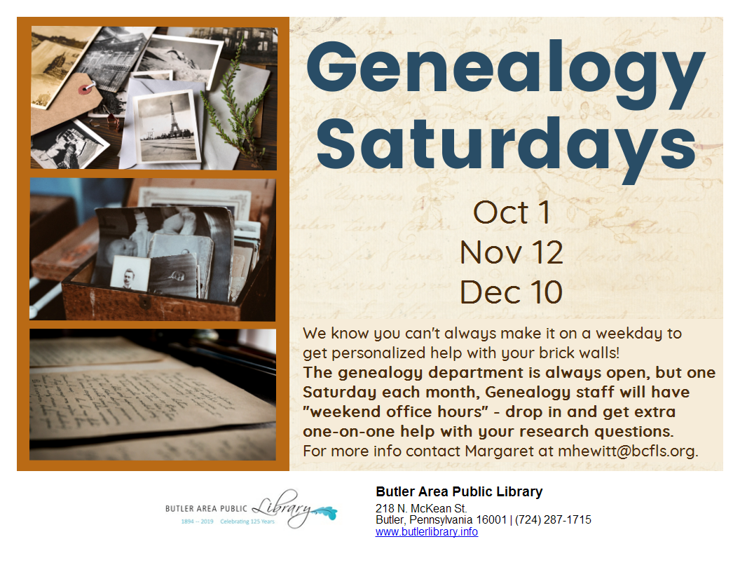 The Genealogy Department is always open for self-directed research on Saturdays, but one Saturday a month we also have staff "office hours" in case you need extra one-on-one help with your family tree and can't make it in to work with a librarian on a weekday.