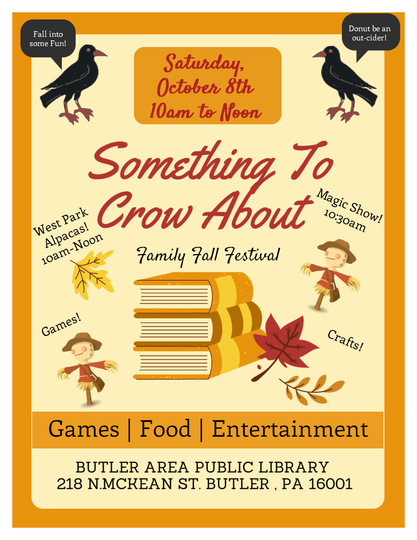Join us for Something to Crow About! Donut be an out-cider...fall into some fun with games, crafts, a magic show at 10:30am, an alpaca visit, and more. It's a family fall festival you won't want to miss. |