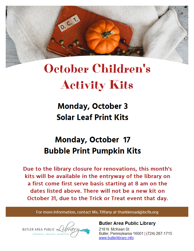 Activity kits will be available in the entryway on the above dates due to renovation schedule. Kits are on a first come, first serve basis.