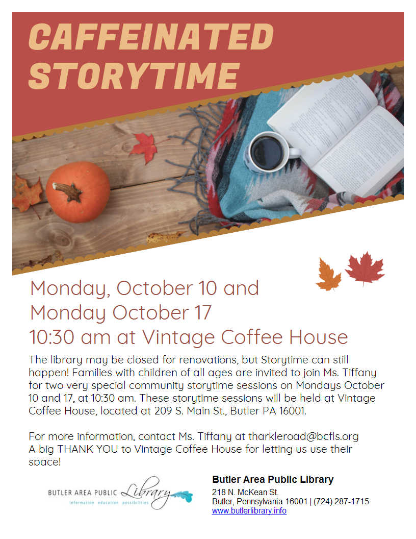 During library renovations, join us for storytime in the community! Families with kids of all ages are invited to join Ms. Tiffany at Vintage Coffee House, 209 S. Main St., Butler for two very special storytime sessions.