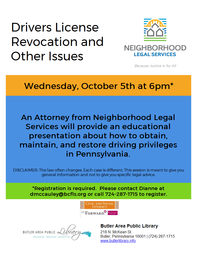 An attorney from Neighborhood Legal Services will provide an educational presentation about how to obtain, maintain, and restore driving privileges in Pennsylvania.