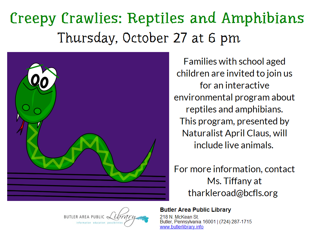 Families with school aged children are invited to an interactive environmental program about reptiles and amphibians. This program, presented by naturalist April Claus, will include live animals.