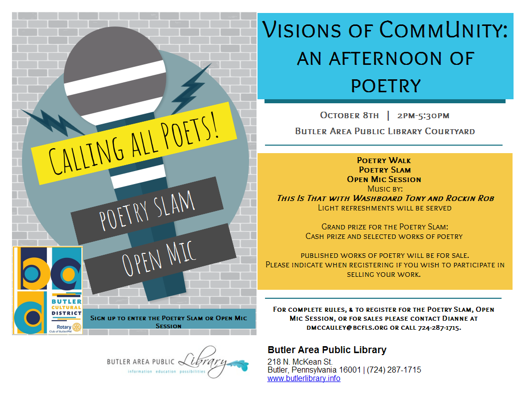 To register to participate in the poetry slam or open mic, to inquire about selling published poetry works at the event, or for complete rules, contact Dianne at dmccauley@bcfls.org or 724-287-1715. |