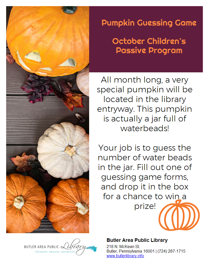 All month long, a very special pumpkin will be located in the library entryway. This pumpkin is actually a jar full of waterbeads! Your job is to guess the number of water beads in the jar. Fill out one of the guessing game forms and drop in the box for a chance to win a prize!