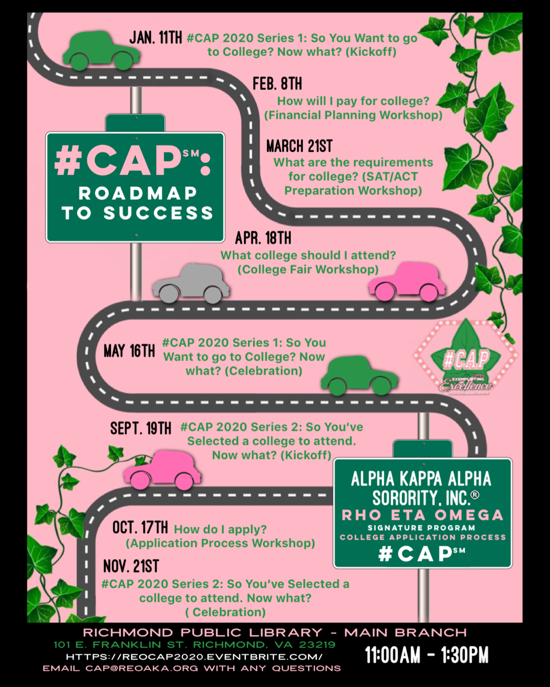 #CAP: Roadmap to Success! Series Calling ALL high schools students! Alpha Kappa Alpha Sorority, Inc.® Rho Eta Omega Chapter would like to assist high school students with an emphasis on juniors and seniors with the College Application Process through our program #CAP: Roadmap to Success! Our two part series not only gives students the tools needed to prepare and pay for college, but how to be successful once there as well. FREE workshops will take place during the Spring and Fall of 2020. February's Topic: How will I pay for college? (Financial planning workshop) Date: Saturday, February 8, 2020 Time: 11:00am - 1:30pm Location: Main, Auditorium