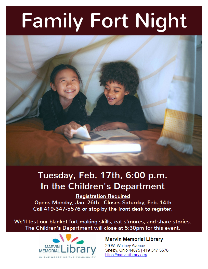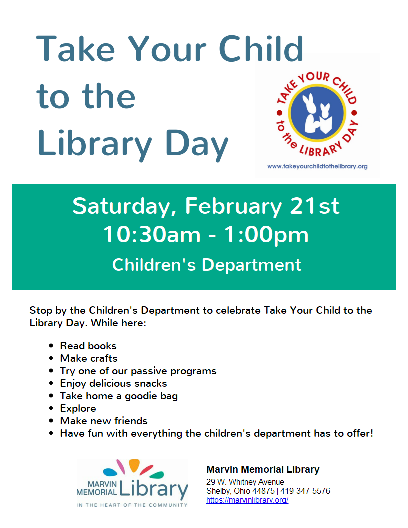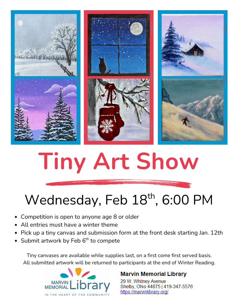 This month's big events include Winter Reading, with chances to win prizes, Take Your Child to the Library Day on February 21, the Marvin 500 Pinewood Derby and the Tiny Art Show!