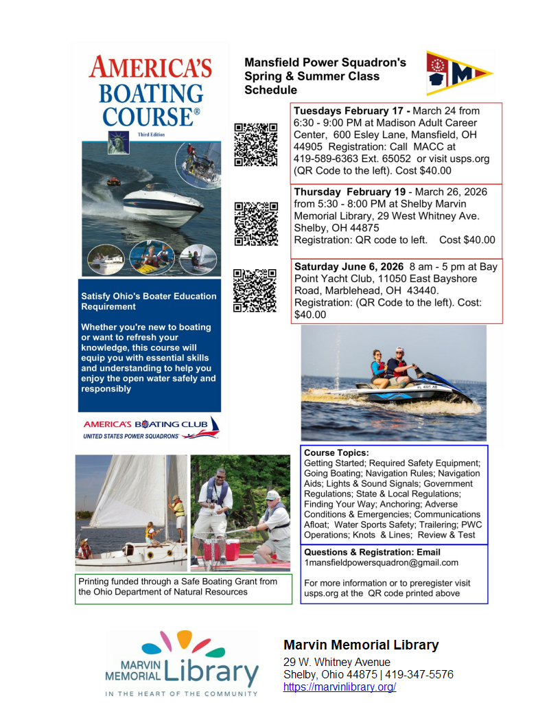 Adults still have time to register for our six-week boating course to prepare for a safe summer on the water. Adults are also invited to three free special events during the week of February 23, featuring presentations on the New Washington Hatchery Industry, the National Bird, and the History of Shelby Tuby. Families can also enjoy Family Fort Night on February 17, with blanket forts, stories, and s’mores, while teens can sign up for Cookie Wars, a cookie decorating competition.