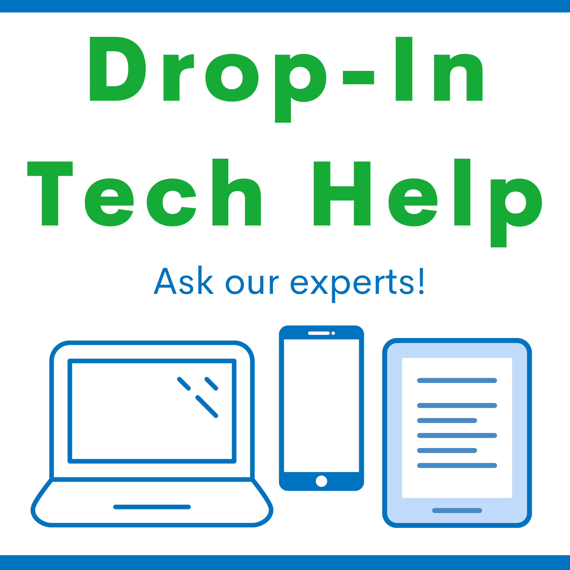 Wireless Wednesday Drop-In Tech Help Weekly. Wednesday afternoons, 4:00-6:00 pm Our drop-in tech help sessions are back! Stop by the library between 4:00-6:00 pm on Wednesdays to ask one of our local technology experts your questions. Remember to bring the device you are asking about with you.