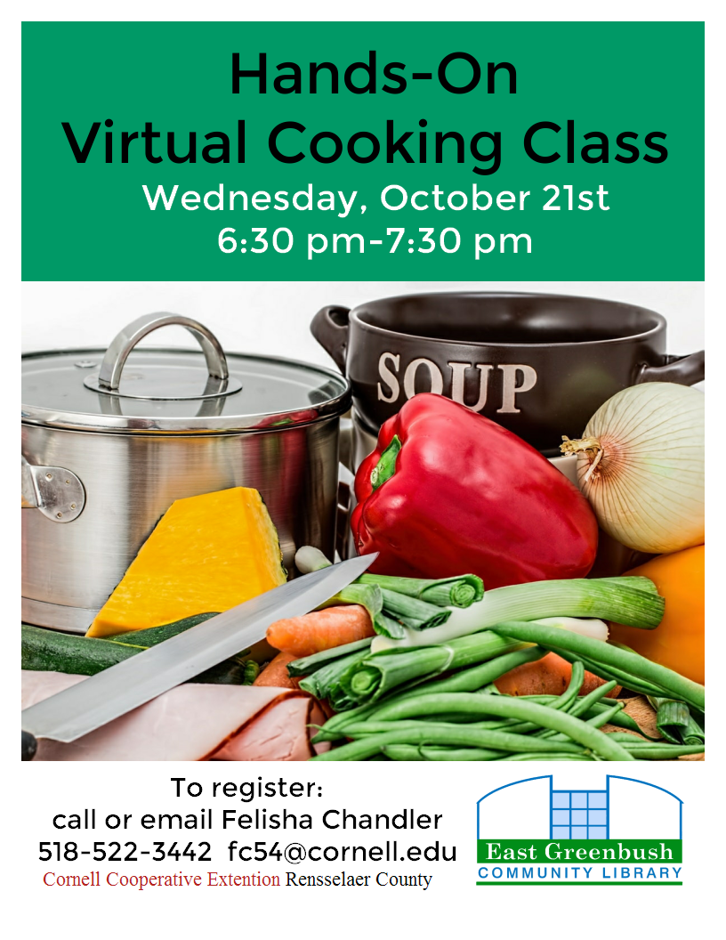 Hands-On Pre-Thanksgiving Cooking Class Wednesday, November 18, 6:30-7:45 pm ZoomHave fun while making Southwest Sheet Pan Veggie Hash & Turkey Tacos (or protein of choice). Felisha Chandler of Cornell Cooperative Extension of Rensselaer County makes learning to cook entertaining and educational. Appropriate for all ages! You will need a computer, laptop, or tablet to see and participate in this class. Please register to join us on Zoom from your own kitchen. The list of ingredients and directions for preparation for class will be sent a week before the event. You will be emailed the link to join us on Zoom the day before the program. Everyone who participates in the class will be in a raffle to win a cookbook!