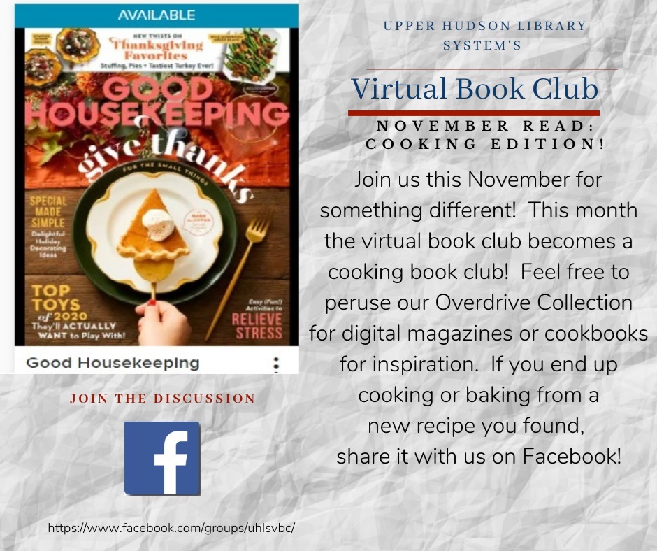 Upper Hudson Library System Virtual Book Club Through November The Upper Hudson Library System is trying something new for its November Virtual Book Club - It's the cooking edition! In November feel free to check out our Overdrive Collection of digital food magazines and cookbooks! If you find and try a new recipe, take a picture and share it with the group! Not a member yet? Request access here.