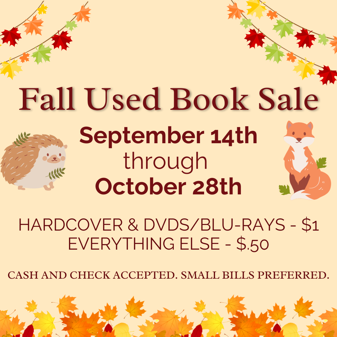 Fall Book Sale All of October Reference Area A month-long event! Hardcover books & DVDs are $1.00. Paperback books & video cassettes are 50¢. Please note: Sales end 30 minutes prior to closing.