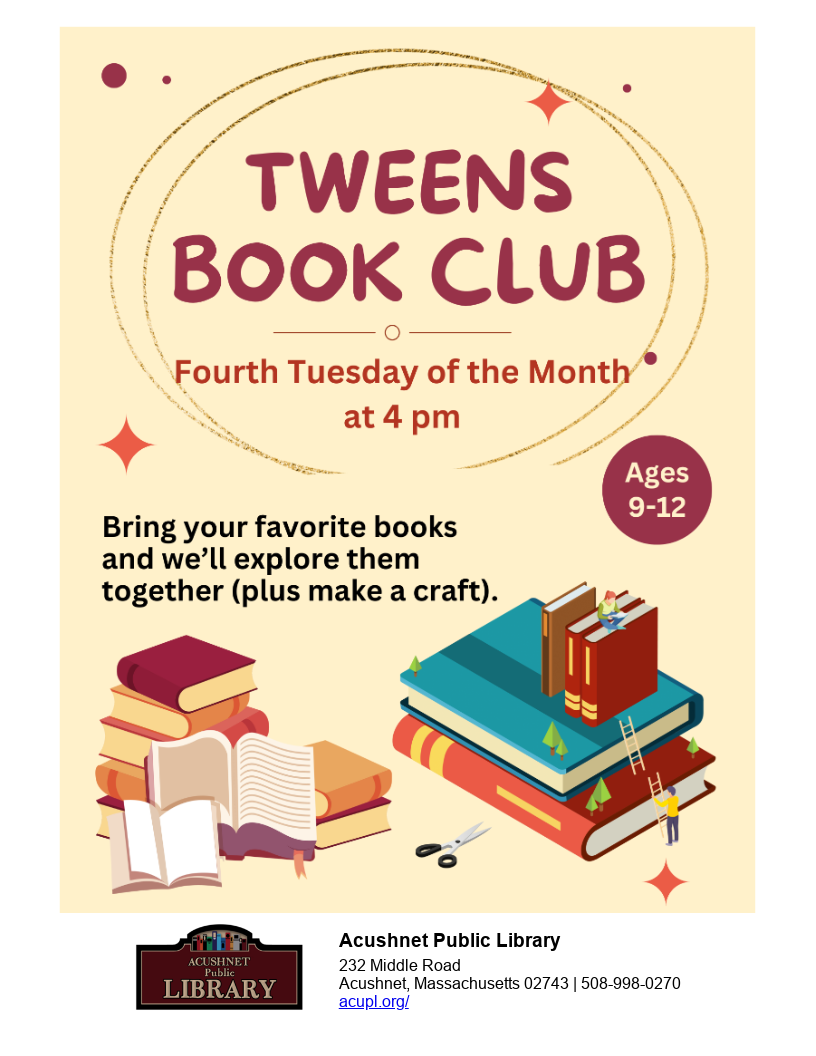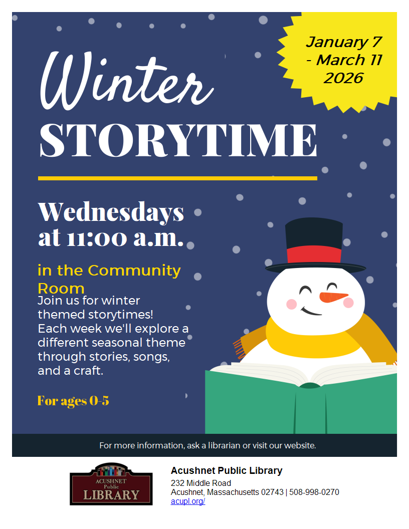 Acushnet Public Library 232 Middle Road Acushnet, Massachusetts 02743 508-998-0270acupl.org/ |