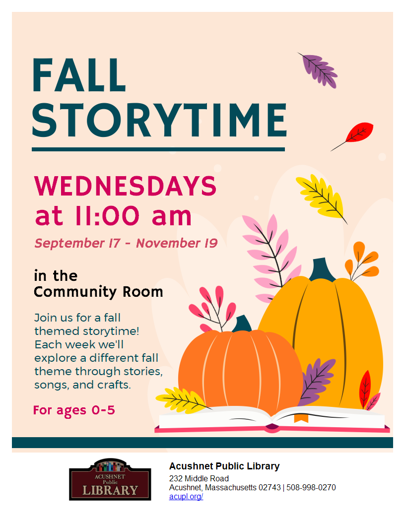 Join your local Coordinated Family and Community Engagement (CFCE) Program for a Play and Learn program with Miss Gloria in the Acushnet Public Library Community Room. Play and Learn is just what it sounds like: We play while we learn, and we learn while we play!! This free parent-child event is scheduled for Thursdays, 10/16/2025, and 10/30/2025, at 11:00 am for families with children from birth to age six! We encourage you to register. For more information and to register, contact Gloria Cardona at gcardona@paceccw.org.