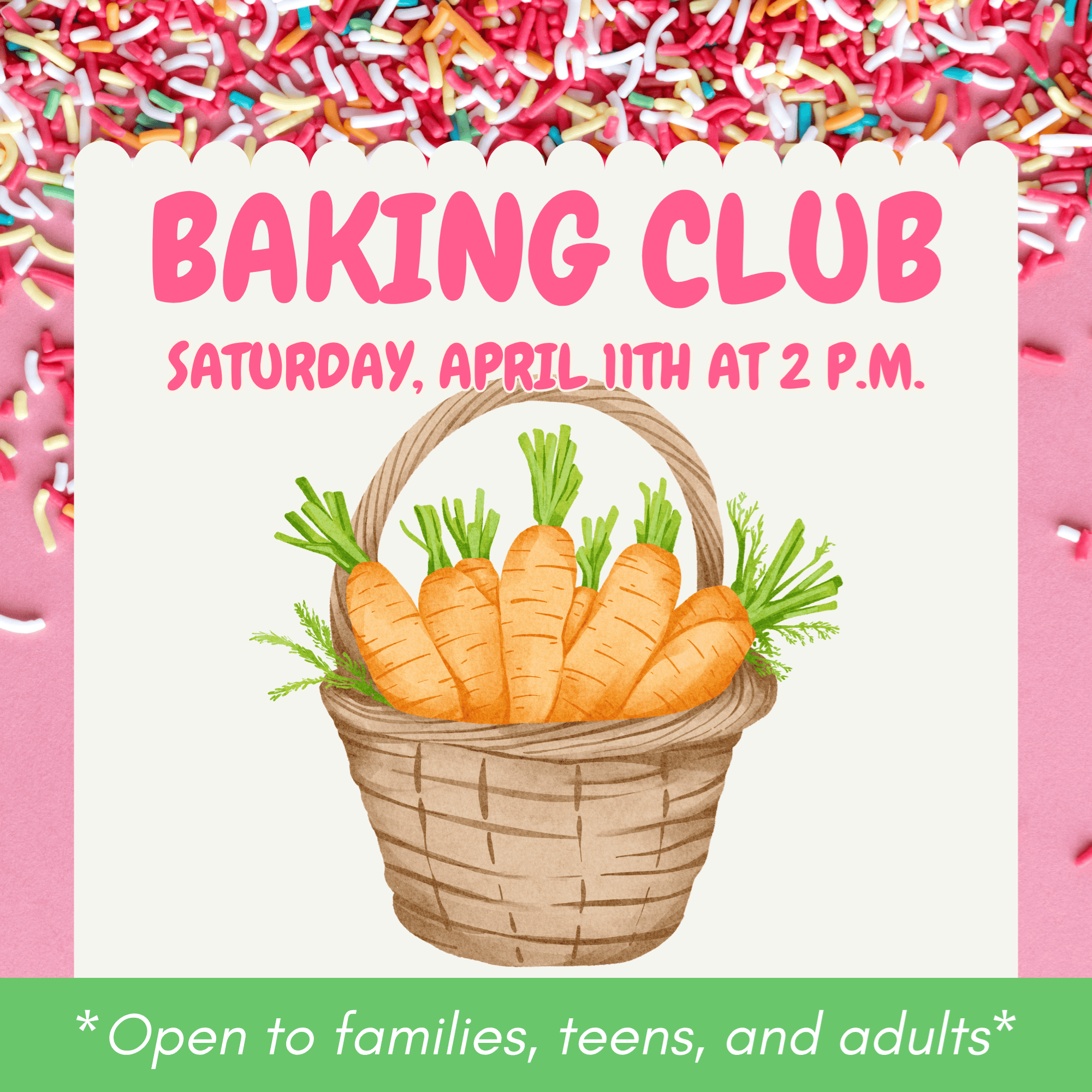 Baking Club - CarrotsSaturday, April 11th at 2 p.m.Please join us for Pembroke Library’s Baking Club! Bake a sweet or savory treat of your choosing and bring it to the library. Meet other bakers and enjoy a delicious treat made by other members in your community. This month's theme is Carrots. Bring in any sweet or savory baked good that you made with carrots to share with other bakers!