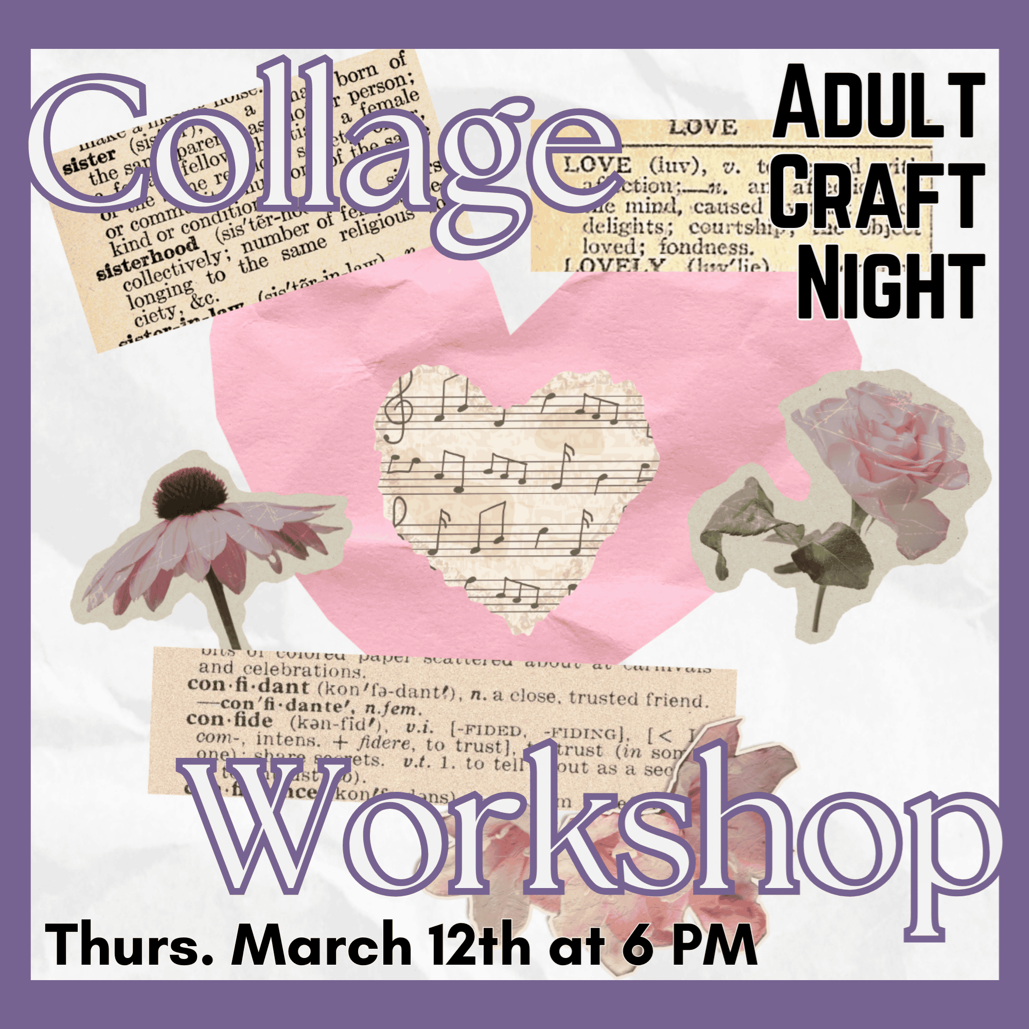 Craft Night: Collage Workshop Thursday, March 12th at 6 p.m. Using atlas and dictionary pages, create a personalized collage of memories, milestones, or special people in your life. Paper, stencils, markers, pens, and stickers will be provided. Please bring your own photos if you would like to incorporate them in your artwork. Registration is required, call the library or click here to sign-up.