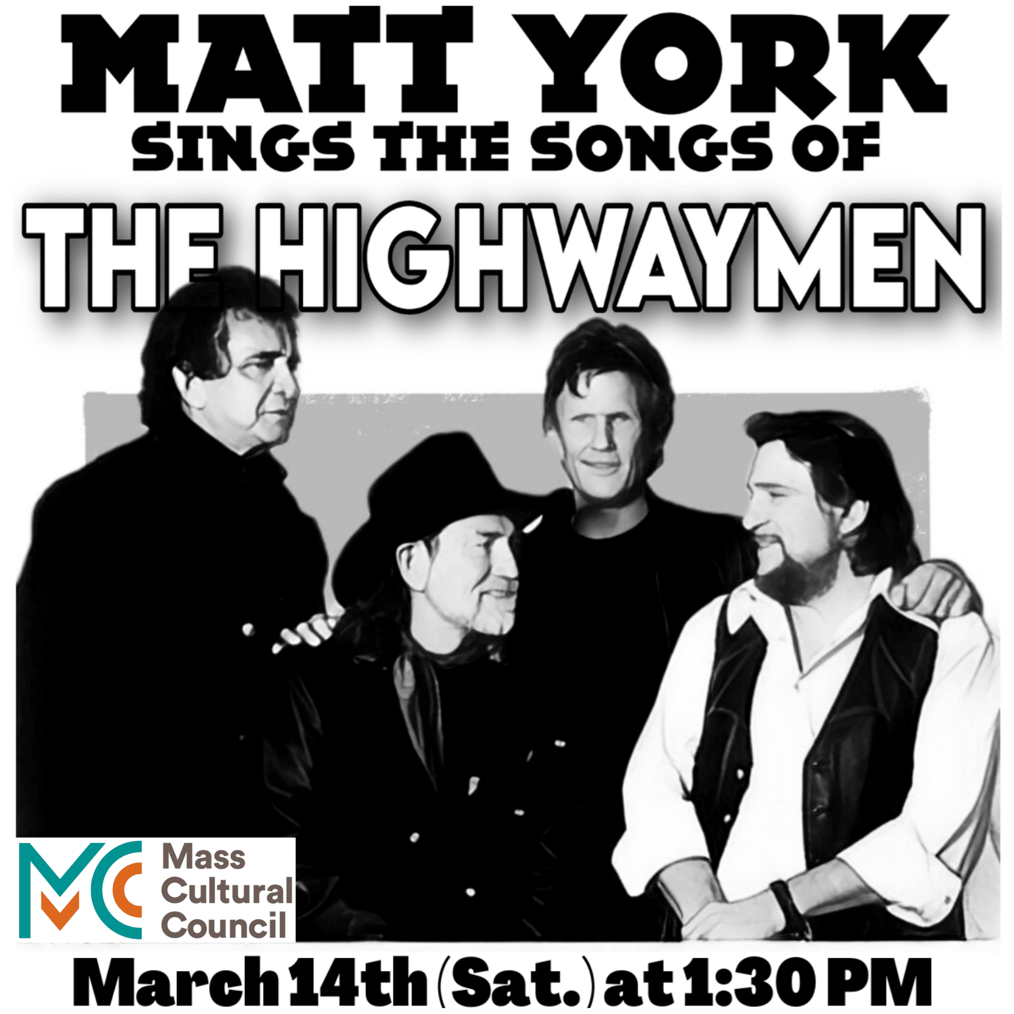 The Highwaymen: A Concert with Matt York Saturday, March 14th at 1:30 p.m.Longtime New England musician/author Matt York will perform the songs of Johnny Cash, Willie Nelson, Kris Kristofferson and Waylon Jennings and tell stories of their careers. The four songwriting legends joined forces in the 1980's to form the country supergroup The Highwaymen. However, prior to that, they'd each established themselves as stars and their careers intersected many times since the 1960's. York has twice been nominated for the Boston Music Award for Best Country Artist and he recently released his second book,The Words and Wisdom of Willie Nelson. This program is supported in part by a grant from the Pembroke Local Cultural Council, a local agency which is supported by the Mass Cultural Council, a state agency.