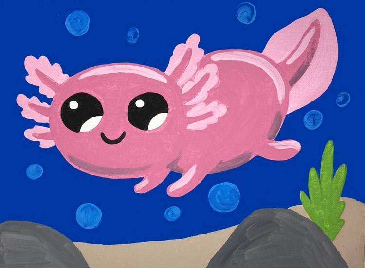 Axolotl Canvas Painting Wednesday, July 26th from 1:30-3:00 p.m. Ages 8-12 will paint an adorable smiling axolotl in Kawaii style while learning fun facts about this Mexican amphibious salamander. Registration required; click/tap this link or call the library at 781-293-6771 to sign up.
