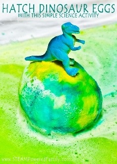 Baking Soda Dinosaur Eggs Mix baking soda and water, then use it to mold eggs around small dinosaurs. For added fun, you can use food coloring to tint the eggs. Let the eggs dry overnight, then kids can go on an egg hunt outside! Using spray bottles, droppers, or spoons, slowly add vinegar to the eggs and watch the fizzing reaction! If you used coloring, you can also explore mixing colors. When you’ve “hatched” all the dinosaurs, give them a quick rinse and you’re ready to play!