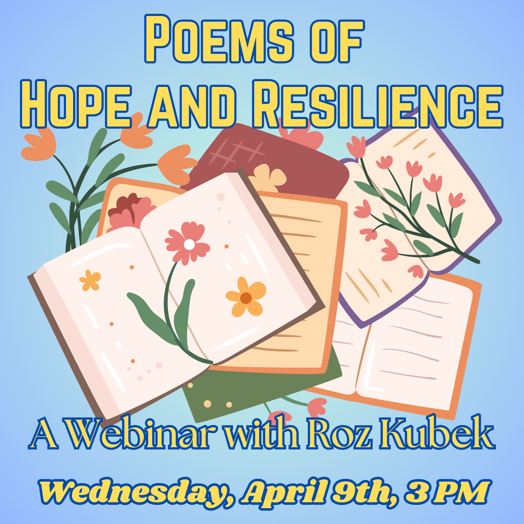 Poetry of Hope and Resilience Wednesday, April 9th at 3:00 p.m. It’s Spring, and time for poems of Hope and Resilience! What better way to celebrate National Poetry month and spring than to visit over poetry? Join popular presenter Roz Kubek for a relaxing and fun webinar of reading and discussing some familiar and some new poems that feed the spirit.