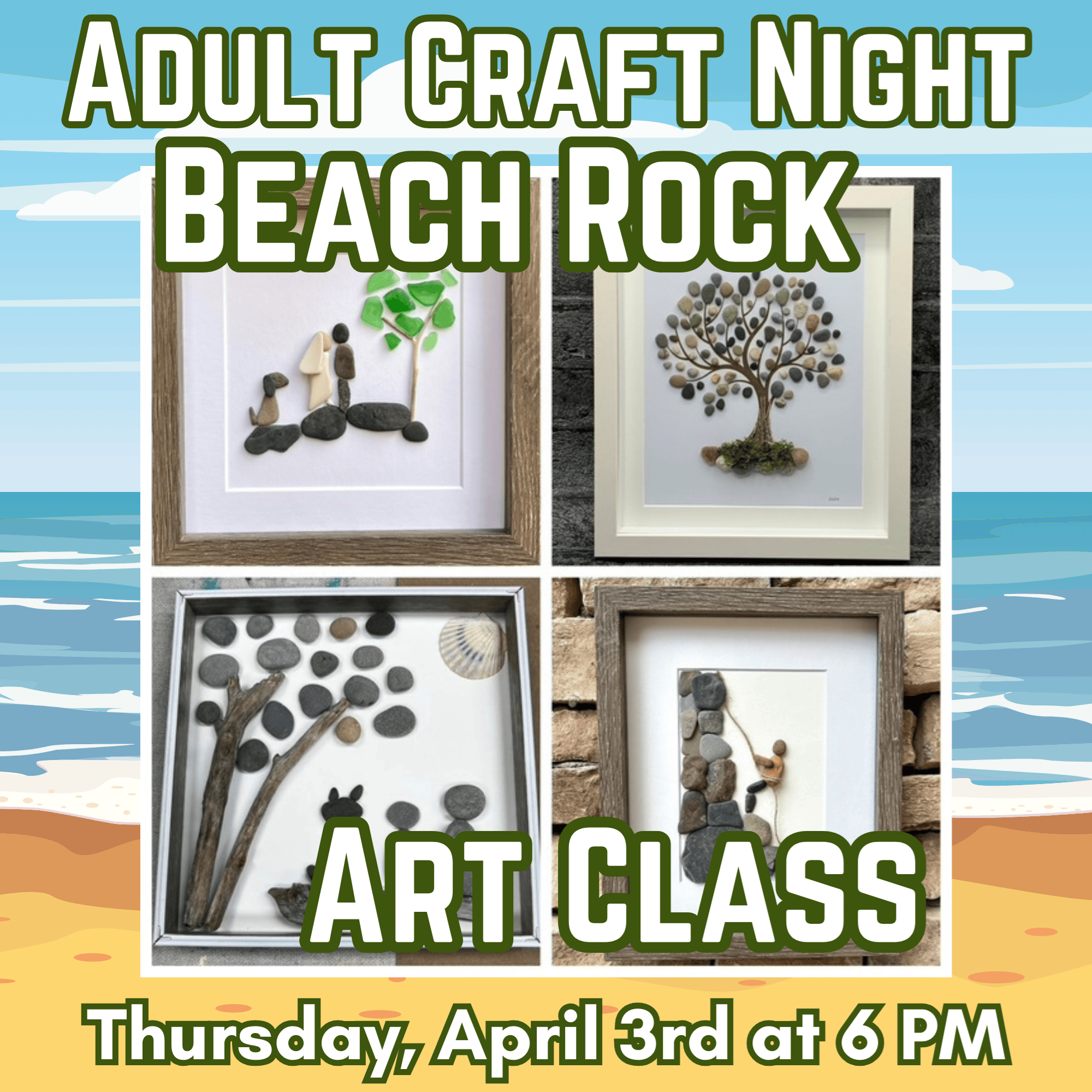 Adult Craft Night: Beach Rock Art Class Thursday, April 3rd from 6:00-7:30 p.m. Join us for a beach rock art class with the library’s very own Sarah Nelson. You’ll make a unique 3D piece of art with beach stones, shells, and other natural media on a plain or painted canvas. All supplies included, call the library or register below to sign-up! Note: As this craft is not suitable for children, this is event is limited to adults only. Please do not bring children with you to this event.
