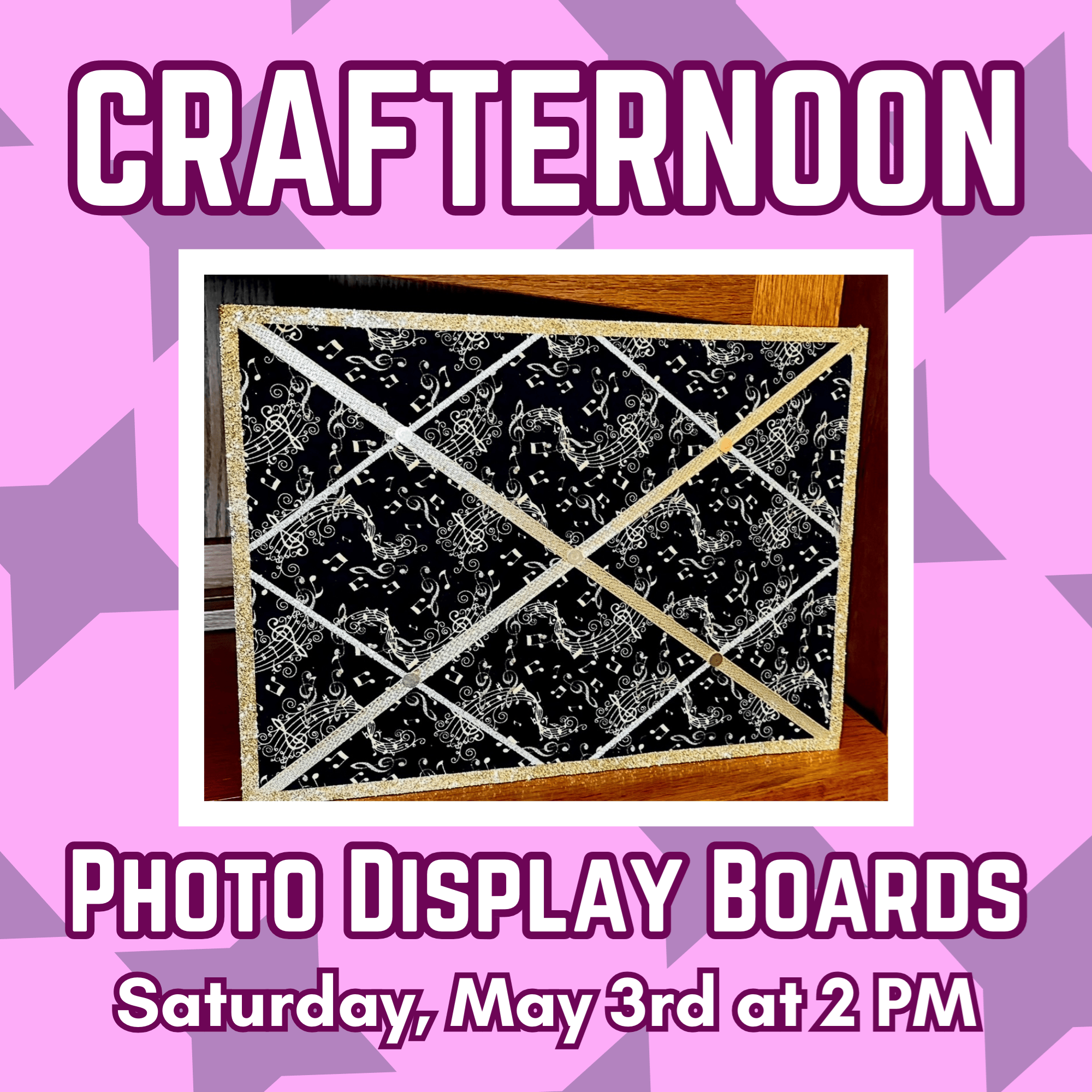 Crafternoon: Photo Display BoardsSaturday, May 3rd at 2:00 p.m. Come join the library’s very own Sarah Nelson as she teaches you how to make your very own photo board, just in time for Mother's Day. Display all of your treasured moments or give it as a gift! All supplies included.
