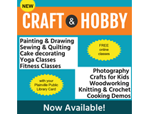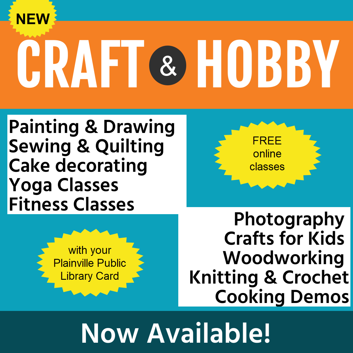 NEW! Craft & Hobby online  What is Craft & Hobby? An online platform that provides Plainville card holders with access to in-depth online instructional videos and classes that span 22 different creative categories The on-demand streaming videos allow you to learn a new hobby or improve your skills with classes taught by world renowned experts. They’ll walk you through each technique with step-by-step demonstrations, providing tips and tricks along the way. What types of videos and classes will I find on Craft & Hobby? There’s something for everyone! Get inspired… Behind the Camera– outdoor photography, timelapse photography, cell phone photography, editing with Lightroom and Photoshop, color theory, composition, exposure, and more! In the Kitchen– Cooking, baking, cookie decorating, and more! With Wood- Beginner, intermediate, and advanced woodworking projects, fundamentals of woodworking tools, materials, and safety, glues, finishes, and more! To Move Your Body- Strength training, low impact workouts, dance, yoga, and more! To Create- Painting, drawing, sewing, crochet, knitting, quilting, embroidery, jewelry making, paper crafting, gardening, and more! The Library will be closed Monday, February 16 for the holiday.