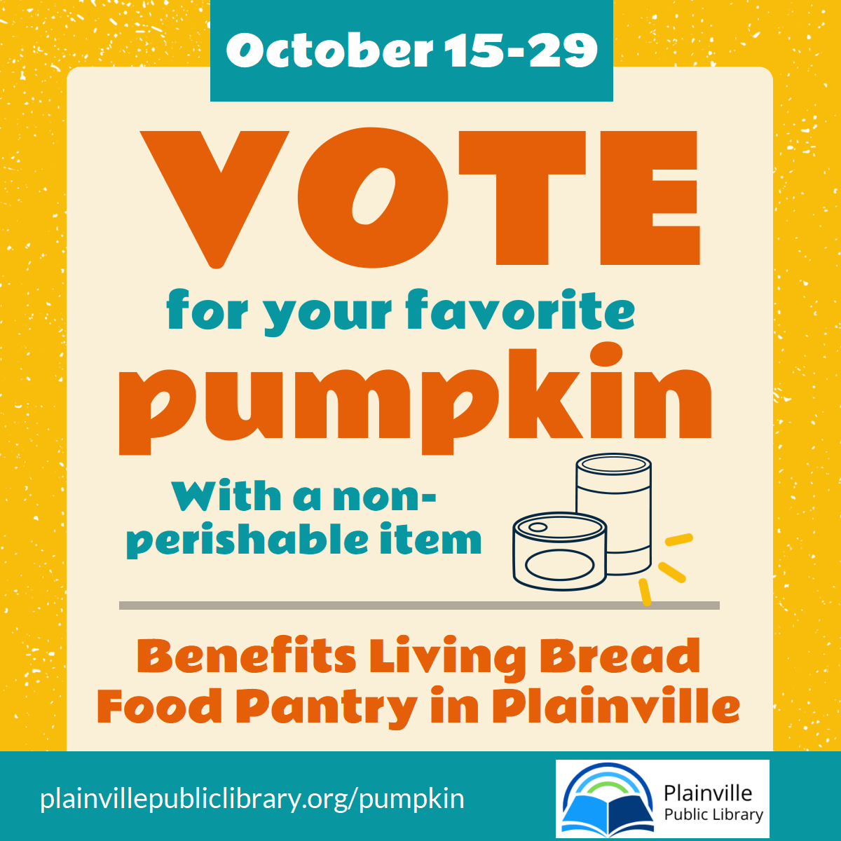 The Annual Book Character Pumpkin Decorating Contest is back! Bring down a decorated pumpkin by Tuesday, October 14 to be included in the contest which benefits the Living Bread Food Pantry. If you decorate a real pumpkin, please do not cut into it. If your masterpiece requires cutting, please use a fake pumpkin. The Pumpkin with the most canned good votes on October 29 will win a $20 gift card to Dunkin. The public will vote between October 15 - 29 with a non-perishable food item to benefit the Living Bread Food Pantry right here in Plainville. It is a WIN - WIN!
