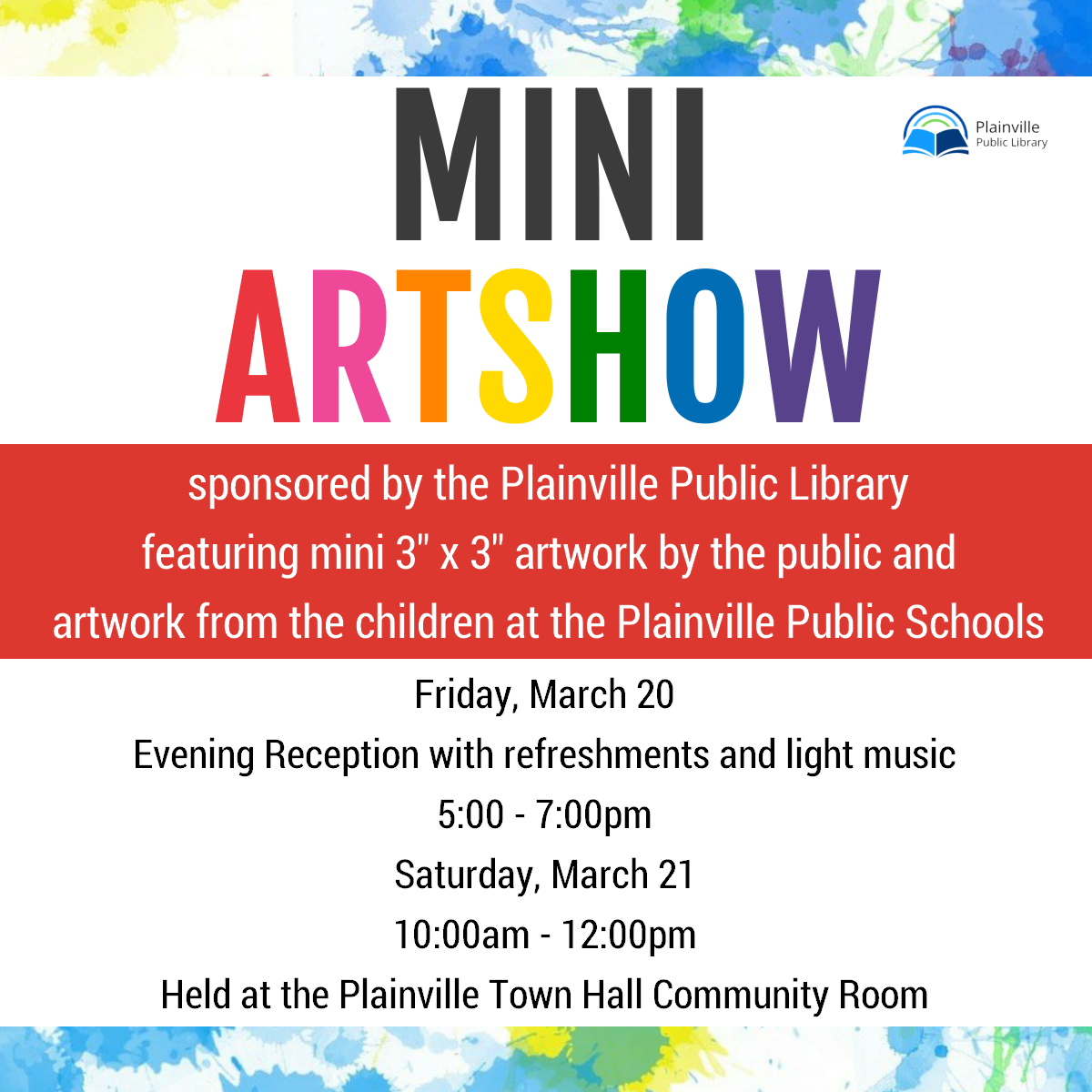 Join our Mini Art Show! This is a fun event for patrons of all ages to show off their art skills on an adorably small 3" x 3" canvas. Decorate a 3" x 3" canvas and return it to the library by March 16 for an exhibition of Plainville mini art! A limited number of 3' x 3" canvases will be available starting February 14. Please register for a canvas. OR You can submit your own canvas as long as it is no bigger than 3" x 3". Yes your art can be 3D as long as it no bigger than a 3x3x3 cube. This is open to all ages and you don't have to an artist to participate! All you have to be is creative! The Rules: One canvas per person or group. The title and subject of the work must be family-friendly. Draw an arrow on the back of the canvas to indicate the top of your piece (i.e. This side up). Print your first name on the back of the canvas. Patrons can use any materials/mediums - paints, markers, objects, paper, fabric, etc.; except for food and anything electronic or battery powered. All materials may be glued to the canvas, but artwork must remain 3"x3"x3". No vulgarity of any kind permitted - this is a family art show! Staff reserves the right to reject any canvases that do not follow these rules! By submitting your art, you are agreeing to let the Plainville Public Library display, photograph, and promote your work in print, in person, and online. Register online between 1/1/2026 12:00 AM and 3/16/2026 11:45 PM.