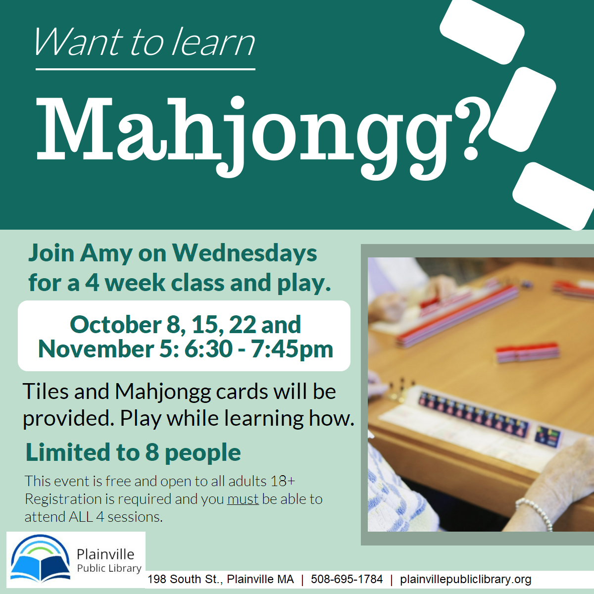 Join Amy for a 4 week Mahjongg class and play. You must be able to attend all 4 sessions on October 8, 15, 22 and November 5: 6:30 - 7:45pm. Limited to 8 adults for 2 tables of 4 to learn how to play Mahjongg. Tiles and cards will be provided during the class. If you have any questions please email Amy at abrams96@comcast.net This is your chance to learn how to play Mahjongg in a great supportive environment with our volunteer teacher, Amy. Register online between 9/24/2025 12:00 AM and 10/8/2025 9:00 AM.