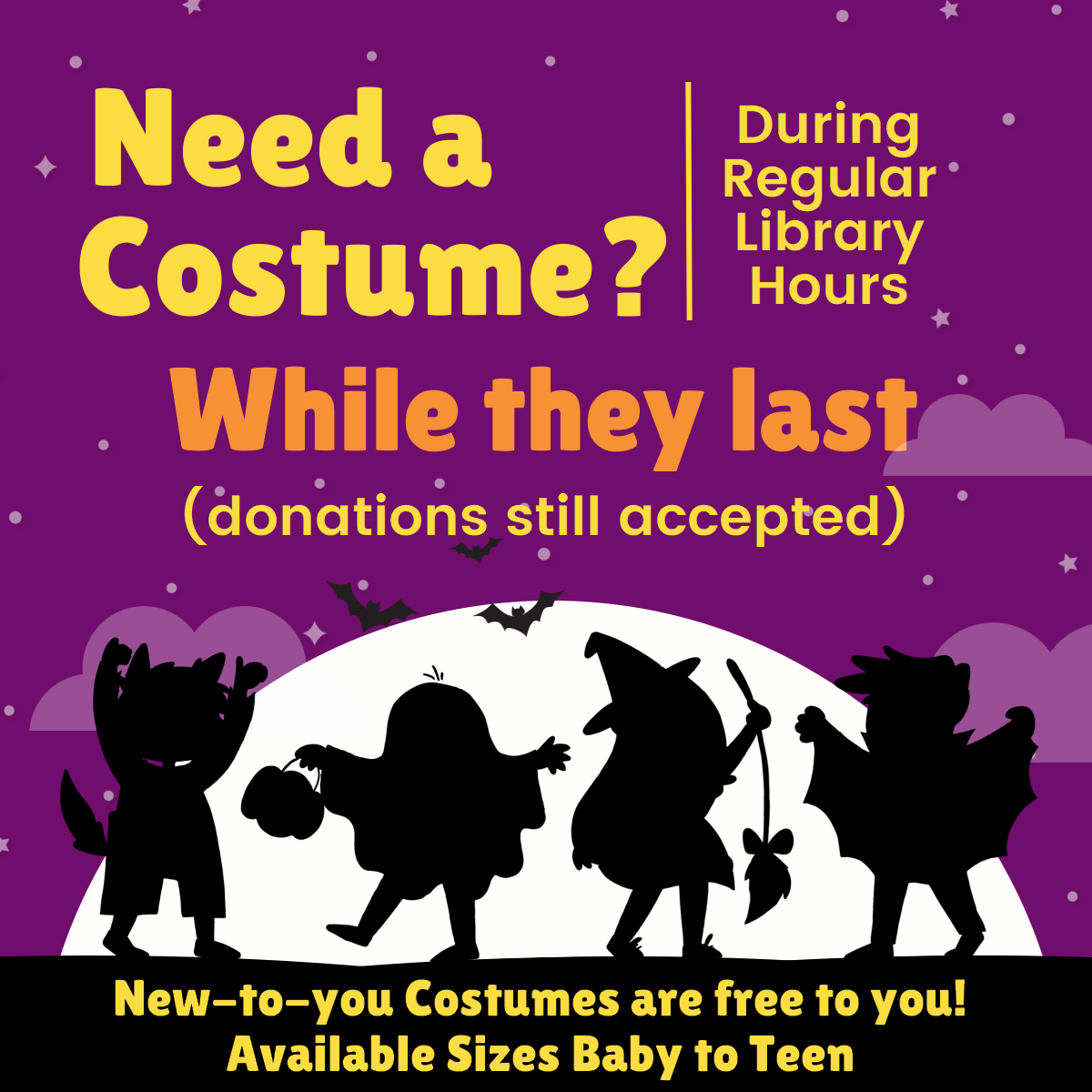 Costumes for baby through teen will be available at the Library during regular hours. These new-to-you costumes are available free to you. Please take what you need. Costumes will be available while they last or through October 30. Donations will still be accepted through October and will be put out as we get them.